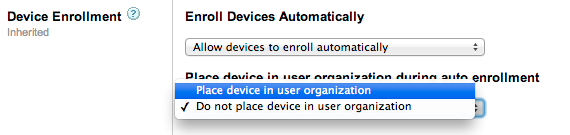 I haven't quite decided how I'm going to handle this, turn it on or off? If I turn it on, it will go into the OU that I have set up for users. For example, if a 12th grader from Jefferson enrolls it, it will go into Students/High School/Jefferson/2013. But I want it to go into Students/High School/Jefferson/Devices.