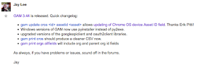 As mentioned by +Karl Hehr on GAFE Admins, GAM now supports updating the Asset Field for Chromebooks! You'll have to update GAM. I've tried and now I'm stuck with an error when completing my update so I'm not able to test it lol. But anyways, awesome!